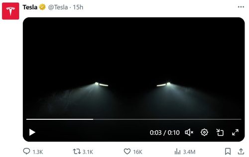 테슬라가 이후 게시한 두 번째 영상에는 어둠 속에 주차된 차량의 헤드라이트만 빛나는 모습이 담겼다.