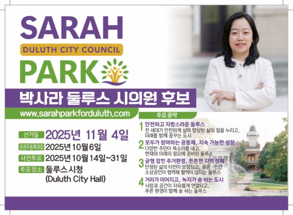 캠페인 관련 정보와 자원봉사 신청은 박사라 후보 공식 웹사이트( www.sarahparkforduluth.com)에서 확인할 수 있다.